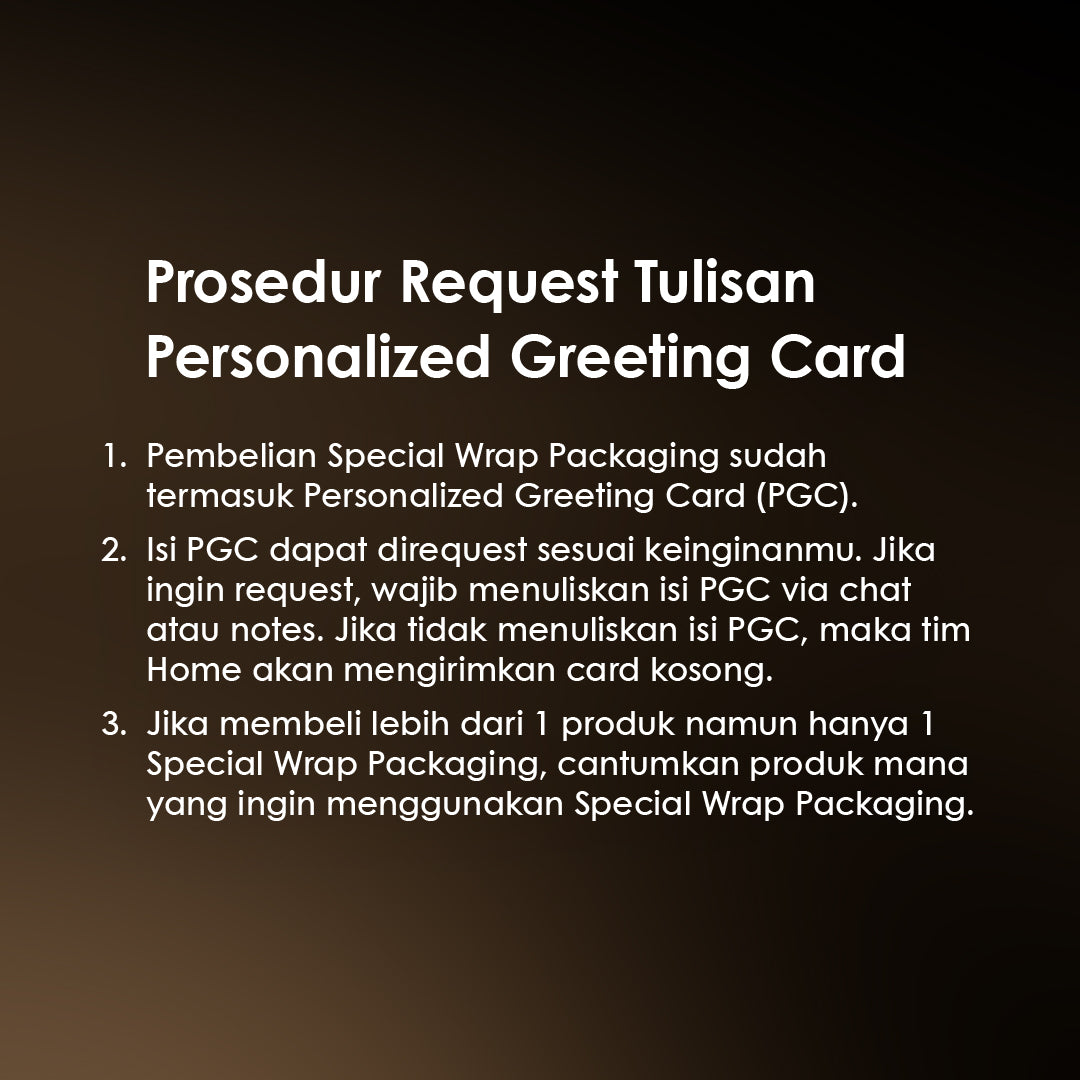 Jika ingin request isi surat di Personalized Greeting Card (PGC), tulis pesanmu di notes atau chat. Jika tidak ada request, akan kami kirimkan card kosong.